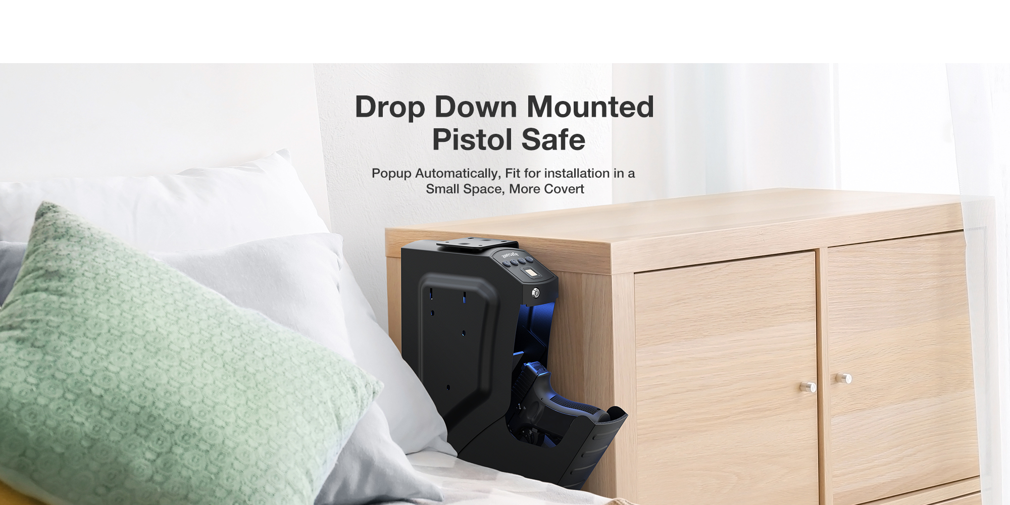 awesafe Gun Safe, Drop Down Biometric Handgun Safe Quick Access for Nightstand Wall Mounted Bedside Single Pistol Safe with Fingerprint, Keypad Lock and 2 Keys
